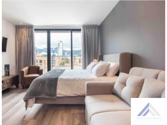 Apartamento - apartaestudio tipo loft amoblado y dotado en Chicó III. En excelente edificio con magníficas zonas comunes. 33 m². Un balcón pequeño. Piso 7. Mira hacia el oriente: montañas. 1 baño. Walk-in closet. 1 garaje. Depósito. Edificio de 2021, terraza comunal, BBQ, gimnasio, zona de yoga, coworking, billar, lounge-bar, sala de juntas, salones, restaurante, peluquería, sala de masajes, lobby, lavandería comunal, 3 ascensores, vigilancia 24/7, amplio parqueadero de visitantes, caldera y planta eléctrica total. Precio publicado no incluye la administración ni el garaje. En caso de necesitar el parqueadero, se debe pagar $300 mil adicionales.